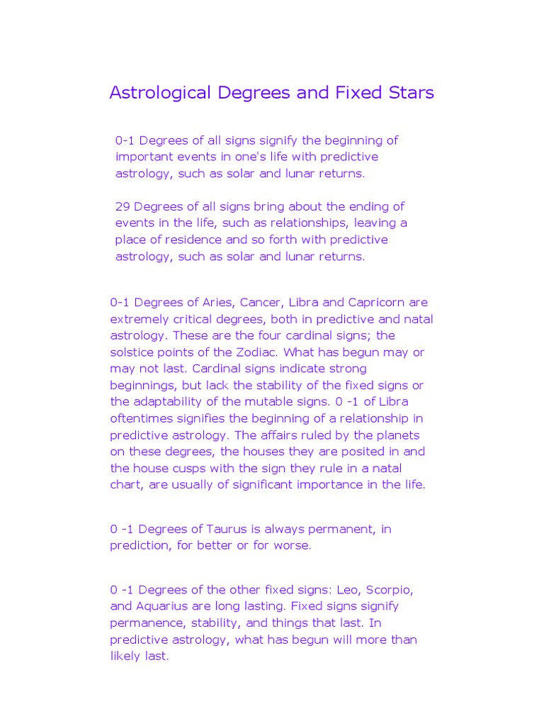 Astrology on the Web: Fixed Stars Rob Tillett, the author of this article, is a poet, astrologer and musician. As well as being a magician, healer, dramatist and composer, he is the editor and publisher of Astrology on the Web and has written many of the articles on this website. This article examines the influence of the Fixed Stars, with a comprehensive table of their year 2000 position and the character of their effects. The Fixed Stars in Natal Astrology - Constellations of Words The fixed stars operate by position and are said to "cast no rays," or in other words their aspects are said to be ineffective and their influence to be exerted only by conjunction and parallel. PDF Ancients used the fixed stars more than the wandering planets used by modern ... Ancients used the fixed stars more than the wandering planets used by modern astrologers. With improved technical abilities due to software enhancements, the fixed stars are beginning to make a return in present day astrology. The information contained in these pages is just a sampling of the stars and their meanings. It is designed to