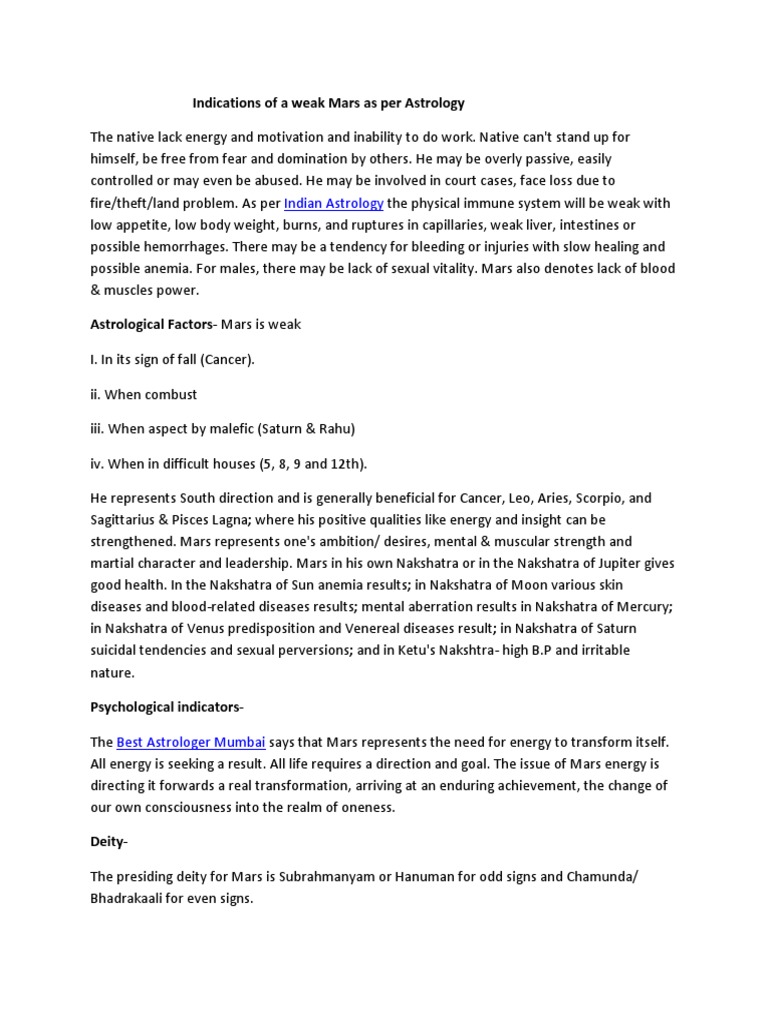 Planet Mars In Astrology - AstroSage What does Mars signify in Vedic Astrology? Mars represents the "younger siblings or specially brother" in native's birth chart. It rules over first house and eighth house in Kaal Purush Kundali in Vedic Astrology and the significator of third house and fourth house. Third house is the house of valour with Mars holding this position in ... Mars in Astrology - Meaning, Signs and Birth Chart - AstroMundus Mars, well-positioned in the birth chart, shares many of the positive characteristics of Aries, the ruling sign. Its disposition is courageous and fearless, but impulsive and irritable. It is a fearless fighter who is not easily intimidated. Never backs down from a challenge and puts all its energy into its natural desire for achievement. Role and Importance of Mars in Astrology Mars is the ruler of Aries and Scorpio zodiac signs. It has been observed that Mars give open aggressiveness to Arians and secretive aggressiveness to Scorpions. Mars also controls passion and indicates strong and uncontrollable sexual urge. Mars plays very important role in marriage of a girl and boy. What Does Mars Mean in Astrology? | by Sanctuary - Medium It ignites the fire beneath your passions and motivations. Mars rules the sign of Aries. The sign that this planet occupies in your chart reveals how you best take action. Mars is an inner planet ...