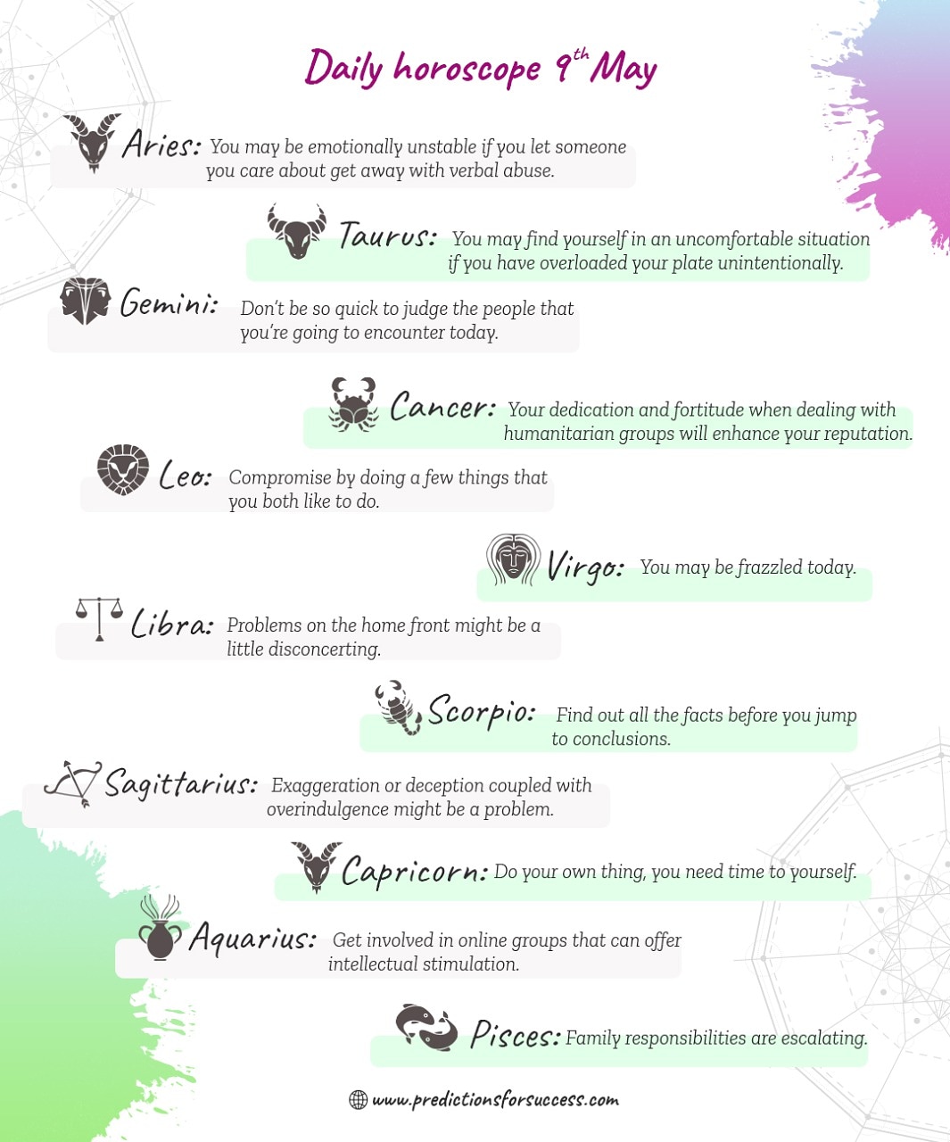 Astrology News, Daily Horoscope by Date of Birth, Zodiac Predictions ... Get the daily horoscope, date of birth, zodiac predictions online and all the Indian astrology news at Times Now. Know about predictions and daily horoscope about love life, wealth, health and other astrology predictions. ... Today, you are like a balloon that may burst any time. You may vent out all the sweet and bitter experiences and feel ...